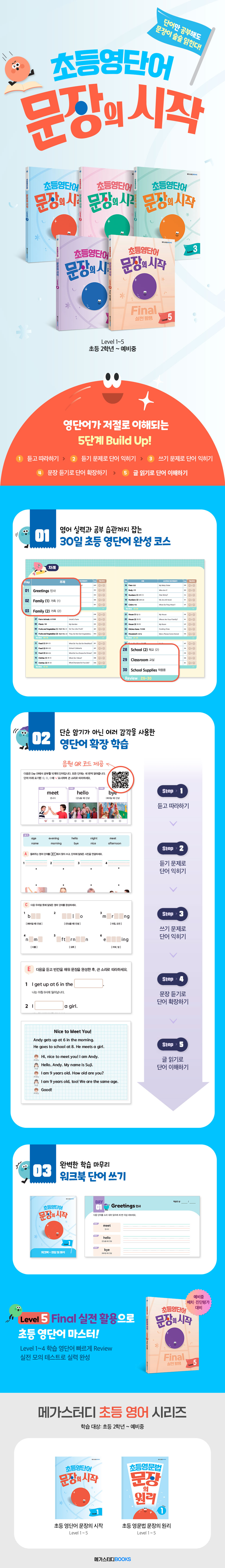 『초등영단어 문장의 시작』은 초등학생이 알아야 할 1200개의 필수 영어 단어를 담은 책이다. Level 5에서는 Level 1-4에서 익힌1200개의 단어가 활용된 문장을 통해, 실제 단어의 쓰임을 확실히 익히고 통문장을 써보며 반복 학습한다. 단어의 쓰임을 익히는 것에서 문장 쓰기로 학습을 확장하며, 전반적인 영어 실력을 한 단계 업그레이드할 수 있다.