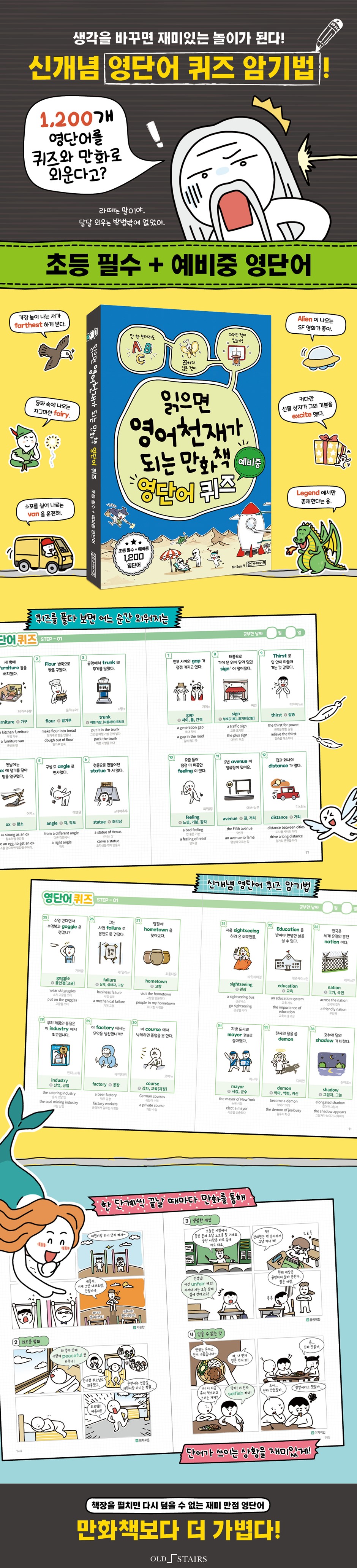 『읽으면 영어천재가 되는 만화책 - 영단어 퀴즈 - 예비중』은 영단어를 처음 접하는 아이들을 위해 흥미로운 만화와 그림 퀴즈로 구성했다. 재밌는 내용으로 영단어에 대한 호기심과 궁금증을 불러일으키고, 의미에 대해 스스로 유추할 수 있게 하며, 결국 그 궁금증을 해결하게 해 준다. 그런 일련의 과정이 저절로 자연스럽게 이어지기 때문에, 기계적으로 외우지 않아도 영단어가 오랫동안 머릿속에 남는 것이다. 『읽으면 영어천재가 되는 만화책 - 영단어 퀴즈 - 예비중』을 통해 우리 아이 영단어를 쉽고 재밌게 시작해 보자.