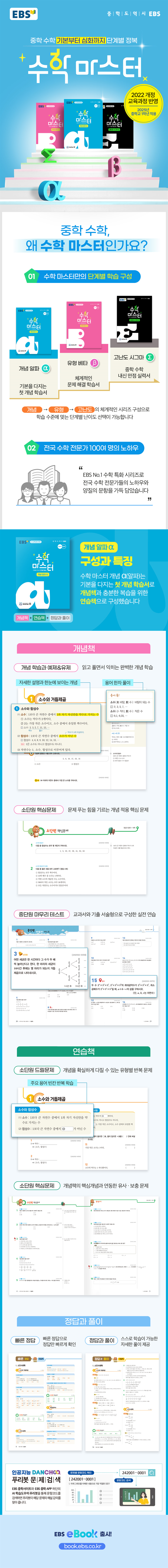 EBS 중학 수학 마스터 시리즈는 체계적인 학습을 위해 개념 α(알파) → 유형 β(베타) → 고난도 Σ(시그마)로 단계를 구성했다. 수학 마스터 유형 β(베타)는 핵심 개념을 대표하는 엄선된 필수 유형 문제로 개념을 익힐 수 있는 두 번째 시리즈이다. 유형책을 통해 소단원별 개념 정리와 핵심개념에 따른 필수 유형 문제를 풀고 보다 높은 난이도의 유사 문제로 개념을 다지며 실력을 더욱 키워보자.