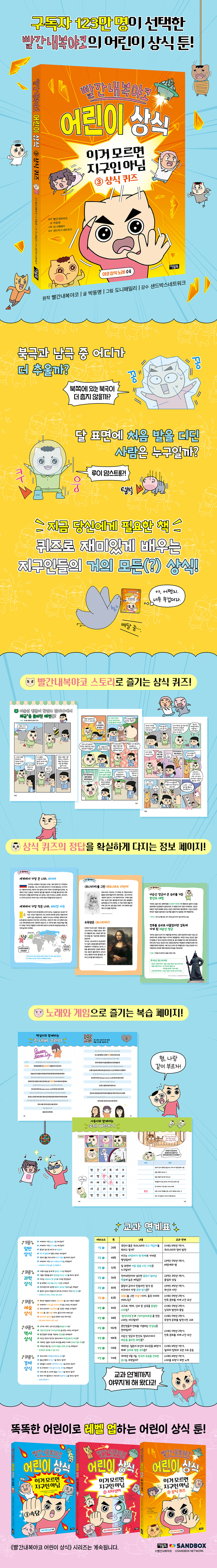 한 번 들으면 절대 잊히지 않는 중독성 강한 노래, 트렌디한 콘텐츠로 123만 명의 구독자들을 사로잡은 빨간내복야코! 이번엔 지구인들의 거의 모든(?) 상식을 들고 등장! 교과 연계는 물론, 퀴즈로 재미까지 야무지게 챙겨 돌아왔다. ‘북극과 남극 중 어디가 더 추울까?’, ‘달 표면에 처음 발을 디딘 사람은 누구일까?’, ‘〈모나리자〉를 그린 사람의 이름은?’ 정답은 『빨간내복야코 어린이 상식』 3권에서 확인해 보시길!