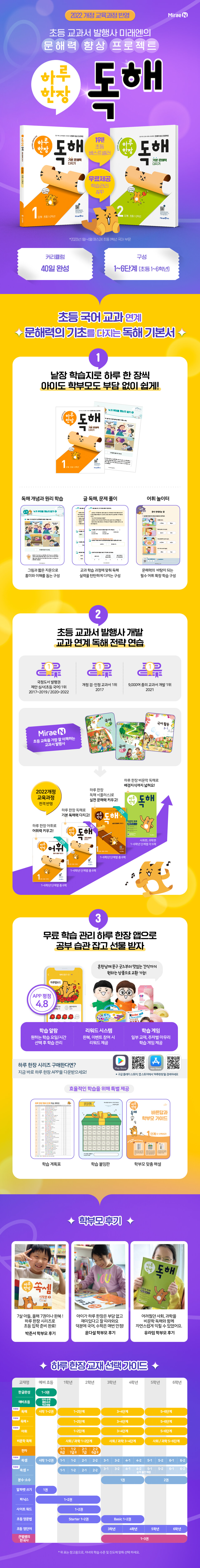 문해력을 키우려면 다양한 글과 여러 문제를 접하고 풀어보아야 합니다. 그 과정에서 가장 중요한 것은 포기하지 않는 마음가짐입니다. 그러려면 교재가 지루하지 않고, 부담스럽지 않아야 하며, 재미 요소가 있어야 합니다. 이를 잘 구현하기 위해 학생들이 재미있어 할 만한 소재의 글로 구성하였으며, 곳곳에 그림도 배치하여 학생들이 지칠 때쯤 사기를 북돋을 수 있게 하였습니다. 무엇보다 하루 한 장 낱장이 주는 가벼움을 체험해 본 학생들은 부담 없이 매일매일 제시된 글을 읽고 문제를 풀 것입니다. 그 과정에서 저절로 공부하는 습관도 기를 수 있을 것입니다. 문해력을 쌓으면서 공부 습관까지 들일 수 있는 일석이조의 교재! 하루 한장 독해 기본편으로 자녀분의 문해력과 공부 습관까지 모두 잡아 보세요!
