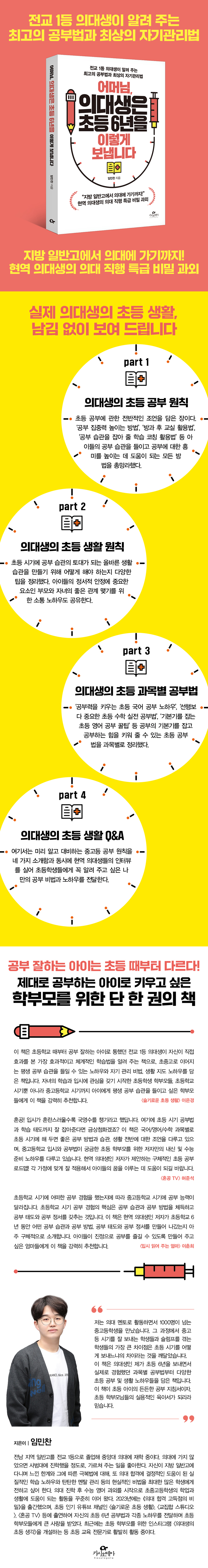 공부법은 저자가 직접 경험한 자신의 초등 시절 사례뿐만 아니라 다른 의대생들의 사례도 반영되었는데, 특히 이 책에는 저자가 ‘초등 시기 공부와 생활’을 주제로 같은 학과 의대생들을 직접 인터뷰한 내용이 포함되어 있다. 의대생들이 초등 시기를 어떻게 보냈는지, 초등학생 때 해 두어 도움이 되었던 것, 하지 않아 후회하는 것, 초등학생들에게 꼭 전해 주고 싶은 과목별 공부법, 나만의 내신 및 수능 공부 비법 등을 생생한 목소리로 전한다. 부모님들뿐만 아니라 의대를 지망하는 학생들까지 직접 읽고 참고해 볼 만하다.