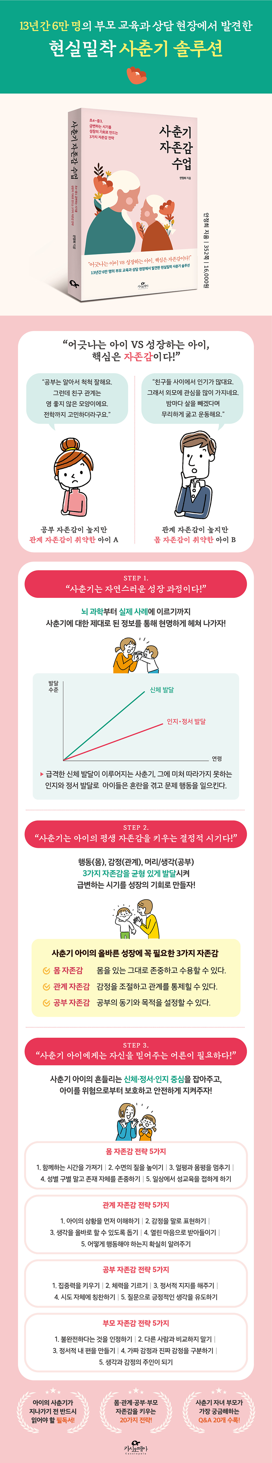 책 속에는 사춘기 아이의 흔들리는 신체·정서·인지 중심을 잡아줄 수 있도록 각 영역의 자존감인 ‘몸 자존감’, ‘관계 자존감’, ‘공부 자존감’을 키우는 전략이 각 5가지씩 담겨 있다. 또한 저자는 “아이는 부모를 보며 자신의 행동을 판단하고 결정한다”고 강조하며, 자녀의 자존감만큼이나 중요한 부모 자신의 자존감을 점검해보고 돌볼 수 있는 방법까지 살뜰하게 전한다.