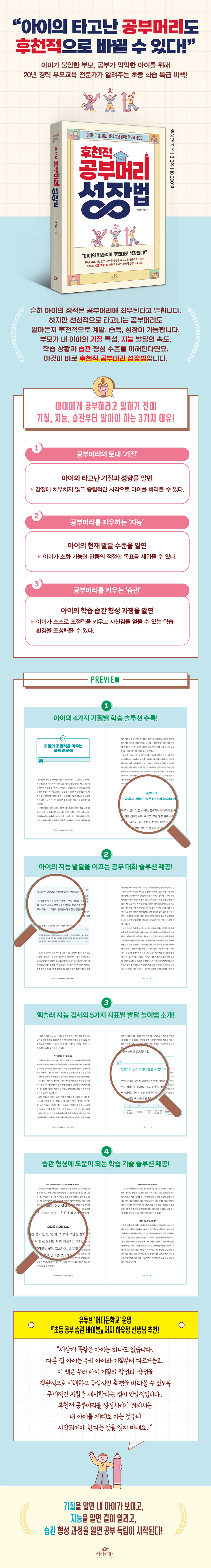 기질, 지능, 습관으로 아이의 학습력을 명쾌하게 설명한 단 한 권의 책 저자는 약 20년간 4천 번 이상의 아이 학습 관련 강연과 상담을 진행해온 부모교육 일타강사이다. 명절과 아이들 생일 빼고는 언제나 강연장에 있다고 해도 과언이 아니다. 그간 저자는 수천 명의 학부모를 만나면서 강연 내용을 다시 듣고 싶다는 요청을 수도 없이 들어왔지만, 모든 강의에 응하기 어려운 순간이 찾아왔다. 그래서 결국 학부모들을 강연장이 아닌 책을 통해 만나기로 결심하고, 4천 번 강연의 핵심만을 그러모아 이 책 한 권에 알차게 담아냈다. 이 책은 아이의 공부를 생각하면 마음이 불안해지는 부모들을 위한 자녀교육서이다. 교육과 관련된 정보의 홍수 속에서 부모들은 늘 마음이 조급하다. 주변의 조언이나 선배 부모들의 성공담, 온라인에서 전문가들이 이야기하는 학습 비결을 보다 보면 무엇을 어떻게 시작해야 할지 좀처럼 감이 잡히질 않는다. 그러나 아무리 좋은 내용이어도 내 아이가 그렇게 할 수 없다면, 내 아이에게 맞지 않는다면 무용한 정보일 뿐이다. 부모가 아이의 학습을 위해 알아야 하는 것은 좋은 정보가 아니라 바로 ‘내 아이에 대한 이해’다. 흔히 아이의 공부머리는 선천적으로 타고난 것이라고 알려져 있다. 그렇기에 자녀교육서 시장에서도 아이의 학습 습관에 관해 다룬 책은 흔하지만, 기질과 지능을 함께 다룬 책은 없다. 그러나 실제로 공부머리는 아이의 기질, 지능, 습관의 총체적 결과이며, 부모의 도움을 통해 얼마든지 후천적으로 계발하고 향상할 수 있다. 이 책에서 저자는 모두에게 통하는 효율적인 학습법을 설명하진 않는다. 대신, 아이의 유형에 따른 ‘아이 맞춤형’ 학습법, 대화법, 놀이법을 담았다. 아이의 기질, 지능을 알면 적절한 학습 속도와 난도를 정할 수 있고, 습관 형성 과정을 이해하면 아이가 올바른 습관을 만들고 조절력을 키우는 데 도움을 줄 수 있다. 무엇보다 이 책을 통해 부모는 내 아이의 기질과 지능 수준이 어떠한지를 명확히 알 수 있고, 아이에게 알맞은 부모의 대화법과 놀이법을 터득함으로써 아이의 학습력을 높이는 데 큰 도움을 줄 수 있다. 이 책 한 권이면 자녀와 부모 사이에 굳건히 자리하고 있던 공부의 벽을 허물고, 주변의 말에도 흔들림 없이 아이를 믿어주는 든든한 부모가 될 수 있을 것이다. 아이의 평생 학습력을 키워줄 골든타임인 초등 시기를 놓치지 말자. 목차프롤로그 “공부의 목표는 ‘합격’이 아니라 ‘성장’이어야 합니다.”