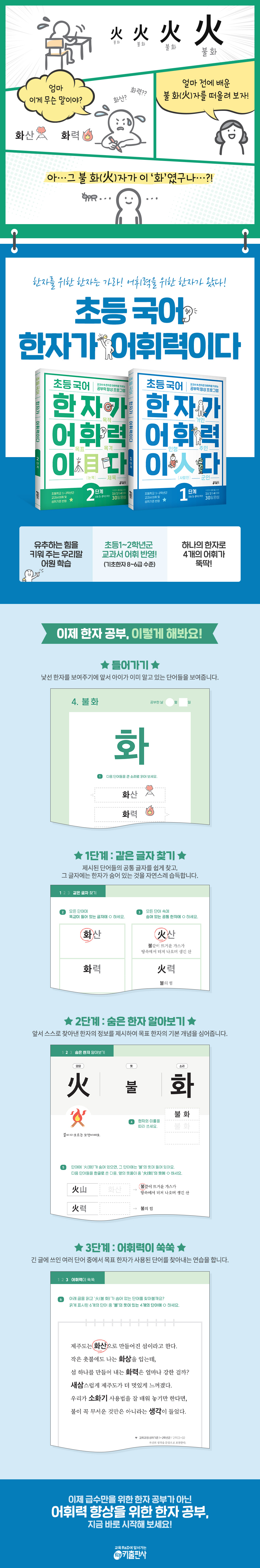 본책 1단원 학교생활 1과 날 일 생일 / 기념일 / 내일 / 일기 2과 들 입 입학 / 입장 / 입구 / 신입생 3과 클 대 대문 / 대상 / 대회 / 대장 4과 한 일 일층 / 이층 / 삼층 / 사층 5과 입 구 식구 / 인구 / 입구 / 출구 6과 윗 상 세상 / 옥상 / 수상 / 상의 7과 아래 하 하의 / 지하도 / 낙하산 / 하교 8과 문 문 방문 / 현관문 / 교문 / 창문 어휘력 점검하기 1 2단원 자연 1과 메 산 한라산 / 등산 / 산길 / 산사태 2과 강 강 한강 / 강물 / 강변 / 강산 3과 나무 목 식목일 / 수목원 / 목발 / 목마 4과 불 화 화산 / 화력 / 화상 / 소화기 5과 흙 토 점토 / 황토 / 토기 / 토종닭 6과 하늘 천 천사 / 천국 / 천장 / 천재 7과 흰 백 백인 / 백곰 / 백호 / 백로 8과 물 수 수영장 / 온수 / 생수 / 음료수 어휘력 점검하기 2 3단원 문학 1과 사람 인 거인 / 군인 / 주인 / 인형 2과 임금 왕 왕관 / 왕자 / 왕비 / 용왕 3과 주인 주 주인 / 주제 / 주요 / 주인공 4과 마음 심 욕심 / 진심 / 열심 / 결심 5과 작을 소 소고 / 소품 / 소심 / 소인국 6과 힘 력 강력 / 실력 / 노력 / 초능력 7과 글월 문 문자 / 문장 / 문학 / 감상문 어휘력 점검하기 3 4단원 가족 1과 아비 부 부모님 / 조부모 / 노부모 / 학부모 2과 형 형 형제 / 삼 형제 / 친형제 / 의형제 3과 사내 남 미남 / 남편 / 남녀 / 남동생 4과 여자 녀 소녀 / 미녀 / 자녀 / 여동생 5과 아들 자 부자 / 모자 / 효자 / 손자 6과 마디 촌 삼촌 / 외삼촌 / 사촌 동생 / 이웃사촌 7과 남편 부 고모부 / 이모부 / 어부 / 농부 어휘력 점검하기 4 * 북인북(정답지) * 한자 색인 * 한자 모아 보기 『한자가 어휘력이다 2단계 초등 1~2학년 추천』 본책 1단원 과학 1과 스스로 자 자기 / 자신감 / 자전거 / 자동차 2과 다닐 행 여행 / 유행 / 비행기 / 행동 3과 돌 석 자석 / 보석 / 석유 / 석공 4과 가운데 중중심 / 중앙 / 공중 / 집중 5과 말씀 언 명언 / 망언 / 예언 / 조언 6과 바를 정 정말 / 정확 / 정직 / 정각 7과 아닐 불 불편 / 불법 / 불행 / 부족 어휘력 점검하기 1 2단원 사회 1과 재주 재 재능 / 재치 / 천재 / 영재 2과 장인 공 공부 / 공장 / 공사장 / 인공 3과 백성 민 주민 / 농민 / 민요 / 민속 4과 시장 시 시장 / 도시 / 시내 / 시민 5과 설 립 국립 / 조립 / 독립 / 입장 6과 동녘 동 동해 / 서해 / 남해 / 북해 7과 네모 방 방석 / 사방 / 지방 / 방언 어휘력 점검하기 2 3단원 일상생활 1과 날 출 출발 / 출석 / 출근 / 출입문 2과 달 월 오월 / 매월 / 세월 / 월급 3과 바깥 외 외출 / 외식 / 외투 / 야외 4과 옛 고 고물 / 고철 / 고목 / 중고 5과 손 수 세수 / 박수 / 악수 / 수동 6과 발 족 족발 / 족욕 / 만족 / 부족 7과 푸를 청 청포도 / 청바지 / 청치마 / 청년 8과 쇠 금 금고 / 입금 / 성금 / 저금통 어휘력 점검하기 3 4단원 학교생활 1과 해 년 작년 / 내년 / 매년 / 학년 2과 먼저 선 선배 / 선행 / 선제골 / 선착순 3과 날 생 생활 / 생태 / 생물 / 생선 4과 글자 자 숫자 / 문자 / 한자 / 천자문 5과 소리 음 고음 / 발음 / 음악 / 음표 6과 나눌 분 구분 / 부분 / 분류 / 분리 7과 빛 색 색연필 / 색종이 / 색칠 / 백색 8과 눈 목 목격 / 목표 / 목적 / 제목 어휘력 점검하기 4 * 북인북(정답지) * 한자 색인 * 한자 모아 보기 출판사 리뷰어휘력과 공부력의 열쇠, 한자! 어떻게 시작해야 할까요?