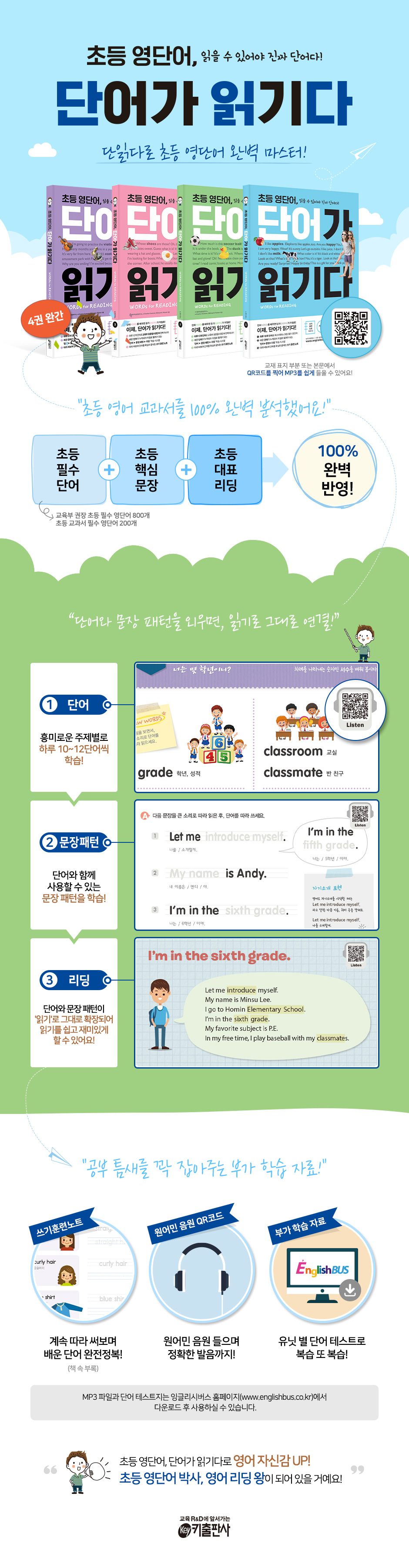 교육부 권장 초등 필수 영단어 800개, 교과서에 나오는 초등 핵심 문장 100문장, 쉽고 재미있는 80개의 리딩을 마스터할 수 있습니다. 〈단어가 읽기다〉는 총 4권으로 구성되어 있어요. Level 1은 초등학교 3학년 과정, Level 2는 4학년 과정, Level 3는 5학년 과정, Level 4는 6학년 과정으로 구성되어 있어, 아주 쉬운 단어와 리딩부터 시작하여, 점차 누적되어 어려운 지문까지 마스터하게 할 수 있게 단계적으로 촘촘하게 구성하였어요.