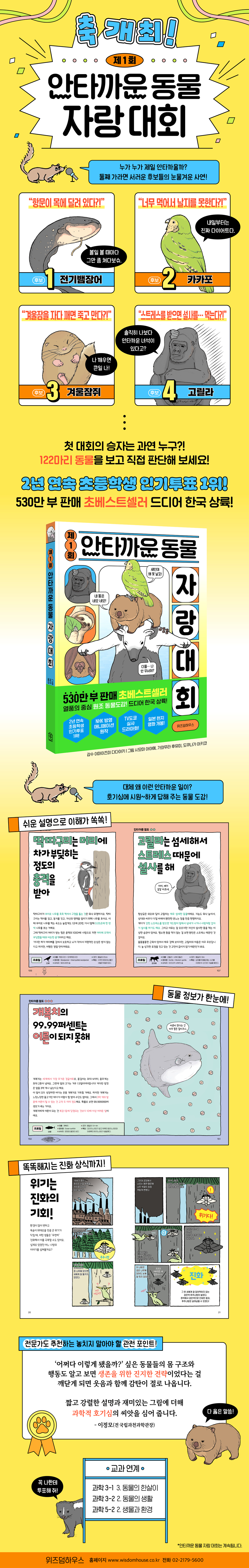 ‘웃기고 유익한 동물도감’의 장을 연 《제1회 안타까운 동물 자랑 대회》의 2권이 출간됐다. 털이 너무 복슬복슬한 나머지 생명의 위협을 받는 앙고라토끼, 얼굴로 오줌을 내보내는 가재, 혀 위에 이빨이 2만 개나 있는 달팽이… 저마다 안타까운 사연을 가진 115마리 동물들의 이야기를 듣고 있자면, 마음이 짠하면서도 대체 어쩌다 그런 처지에 처했는지 호기심이 자극된다. 베스트셀러로 등극했던 1권보다 더 짠하고 독특한 동물들의 이야기를 읽다 보면 재미 보장은 물론이고, 생물에 대한 이해도 쑥쑥 자랄 것이다.